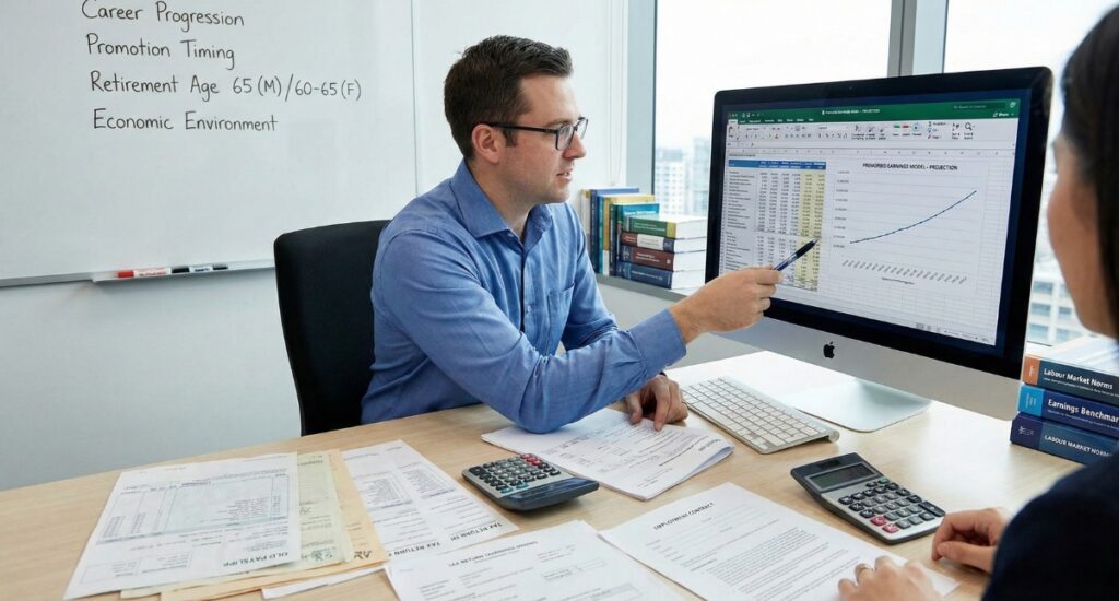 The first step is to establish the claimant’s premorbid earning potential. This involves examining their employment history, past payslips, tax returns, employment contracts, and any available records that help determine a realistic pre-accident income level. From there, the actuary considers how the claimant’s career would likely have progressed. That includes assumptions about promotion timing, earning potential within their industry, historical income progression patterns, and the broader economic environment in which they would have been working.