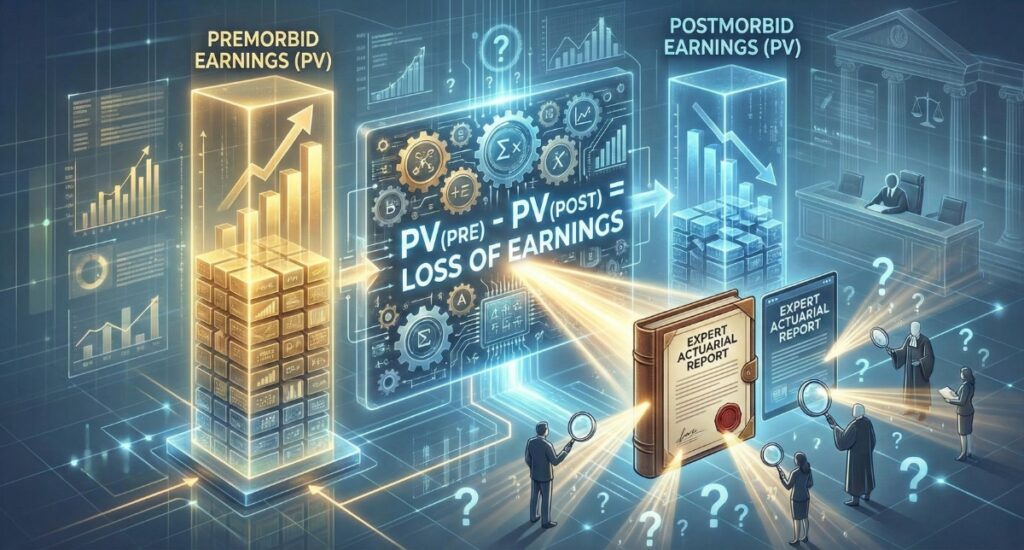 With all assumptions, projections, and adjustments in place, the actuary completes the calculations by comparing the present value of premorbid earnings against the present value of postmorbid earnings. The difference between these two figures represents the claimant’s Loss of Earnings. This result is summarised in a formal expert actuarial report, which must be sufficiently transparent, defensible, and aligned with the evidence so it can withstand scrutiny from opposing actuaries, legal teams, mediators, and the court.