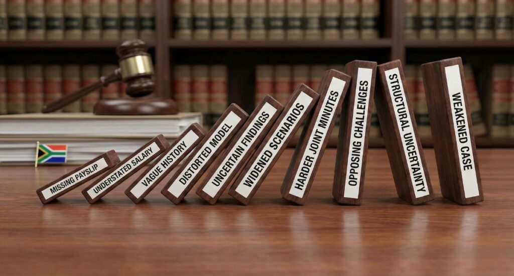 Actuarial models are highly sensitive to input assumptions. A 10% misstatement in earnings can, over a projected working lifetime, translate into a multi-million-rand distortion in damages. Missing employment records can shift contingency arguments. Incorrect inflation adjustments or outdated salary benchmarks can materially alter settlement values.